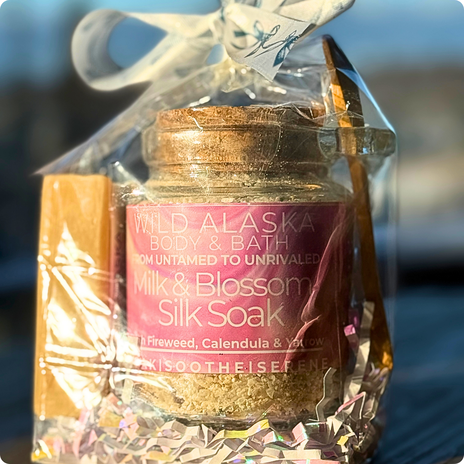Elevate your self-care routine with this eco-conscious Alaskan gift set, designed for sustainable indulgence and seasonal refreshment. It includes a reusable 10 oz glass jar brimming with premium bath soak—infused with hand-harvested Alaskan botanicals like fireweed and chamomile, plus mineral-rich glacier silt for a silky, invigorating soak—complete with a wooden spoon for effortless portioning. Paired with a 2.5 oz cold-process bar soap featuring wild-harvested botanicals for gentle, refreshing cleansing, this thoughtfully curated duo rotates with seasonal scents for year-round delight. Arrives beautifully packaged and ready to gift, making it the perfect pampering treat for yourself or a loved one on any occasion.